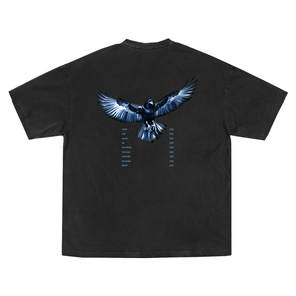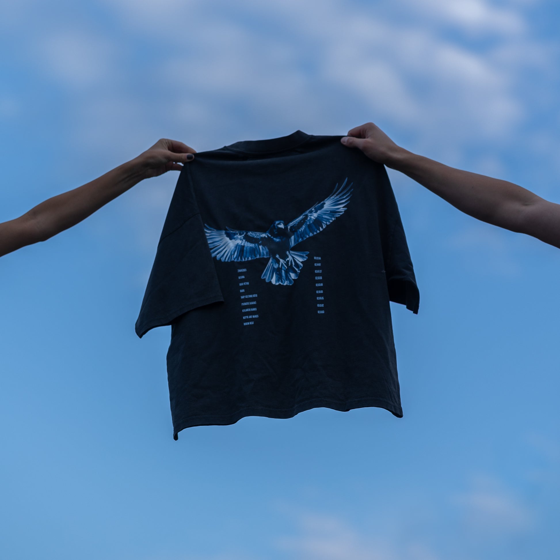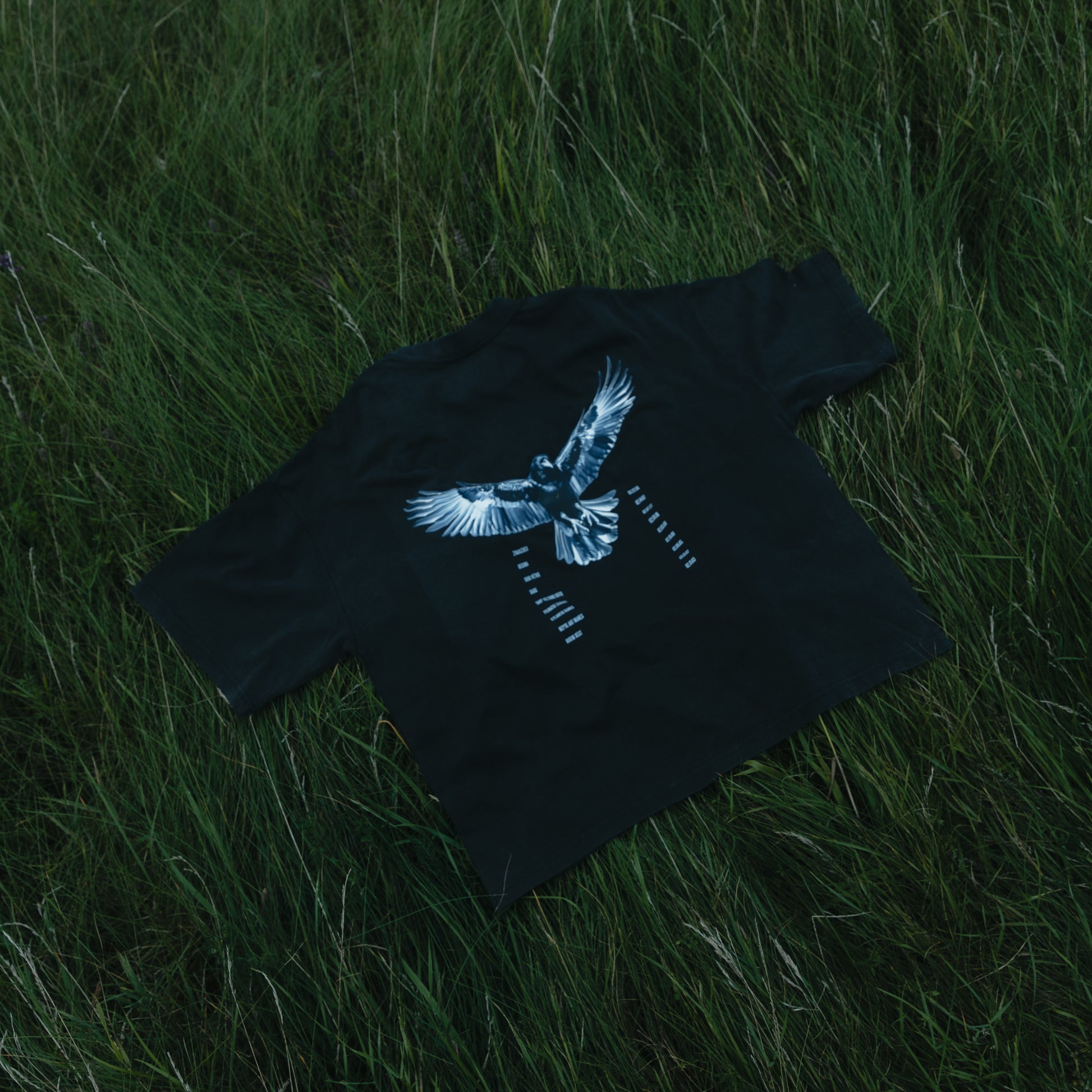Limited Edition Jessica Shy „Sutemos“ juodos spalvos marškinėliai ir iliustracija ant nugaros.