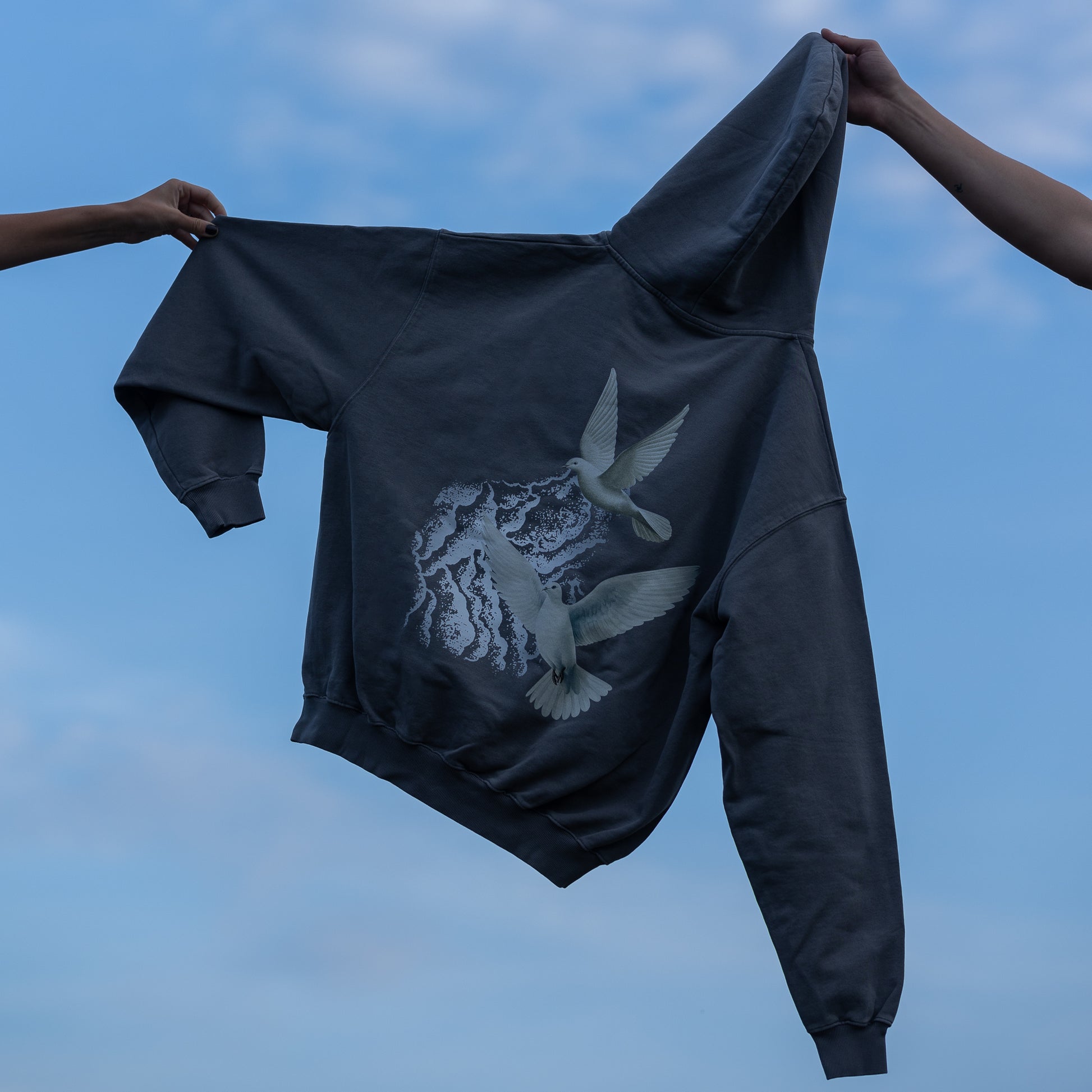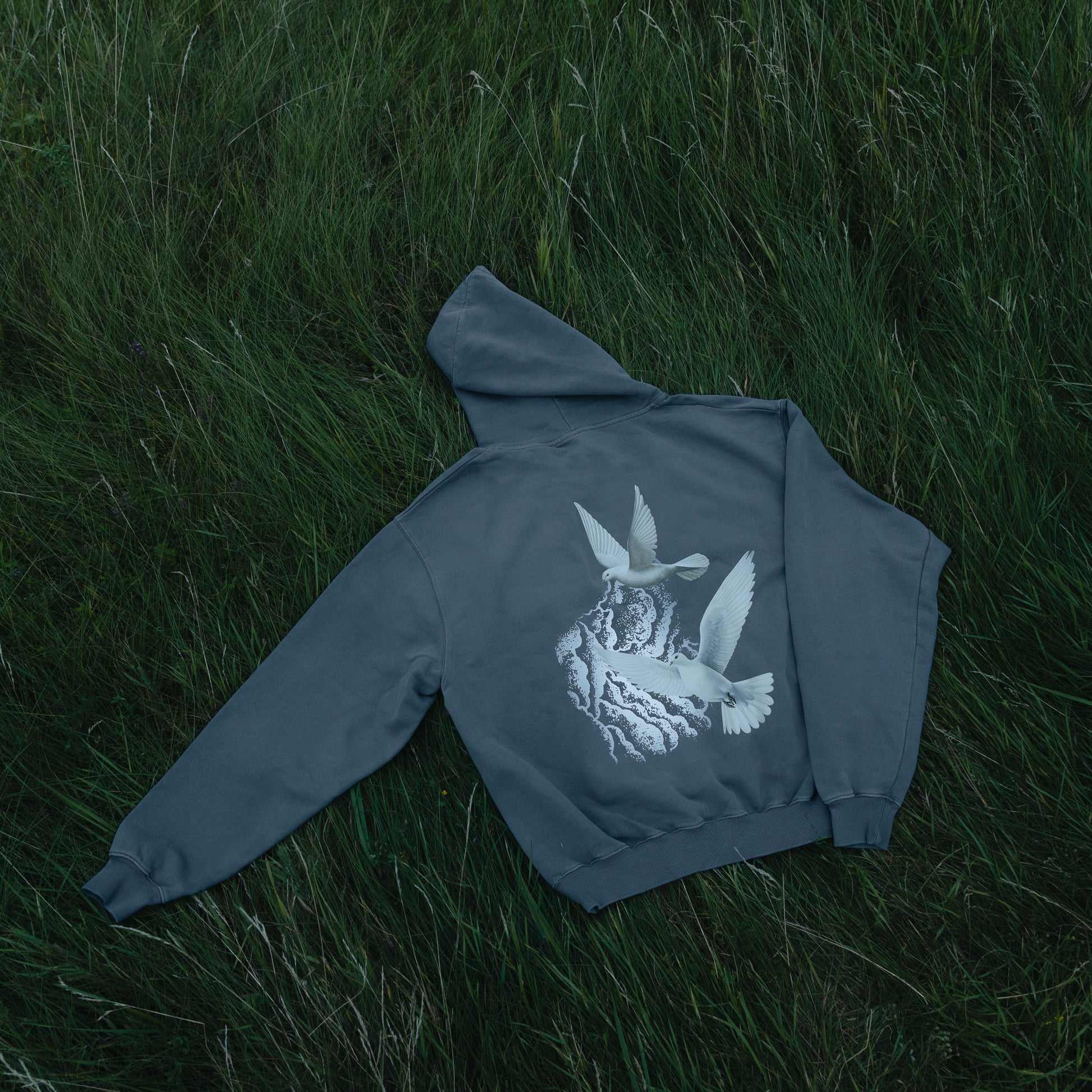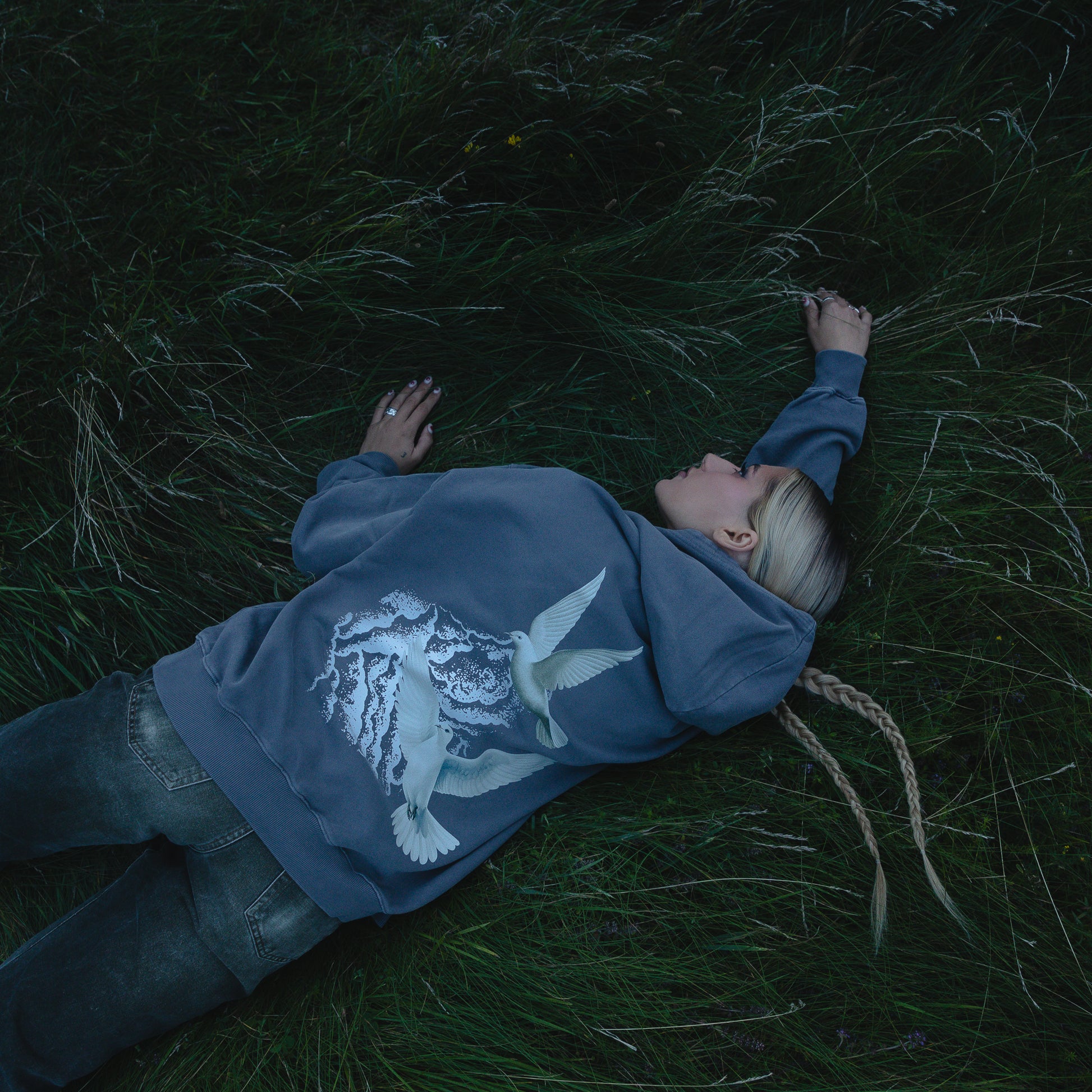Limited Edition Jessica Shy „Sutemos“ šviesiai pilkos spalvos džemperis su kapišonu ir iliustracija ant nugaros.